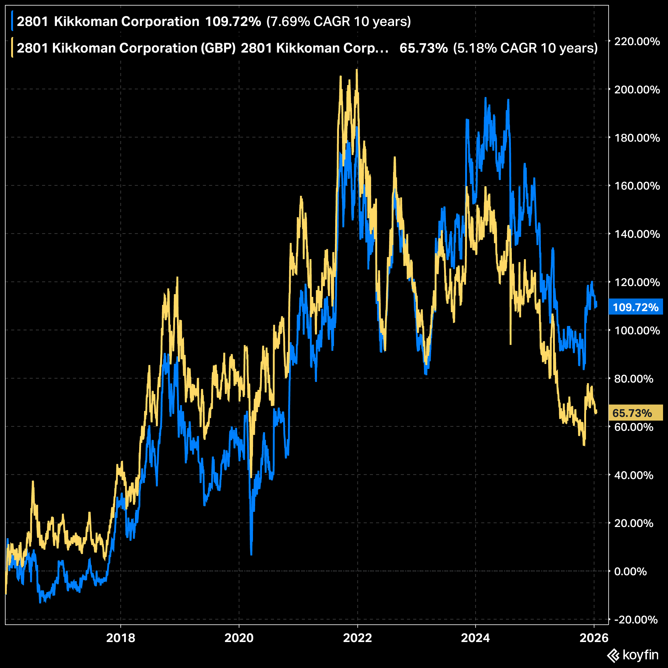 With a high-flying growth style stock like Fast Retailing, a valid entry point could prove to be forgiving when total returns are considered. However, if something is expected to compound at, say, anywhere between 8% and 12%, then a few hundred basis points of FX impact either way can have a more visceral impact. Suppose that domestic investors in Kikkoman over the past decade would have earned a modest 7.7% CAGR with dividends. Not catastrophic by any means, but not fantastic. An investor from the United Kingdom, however, would have earned a 5.2% CAGR after the FX drag had been factored in.