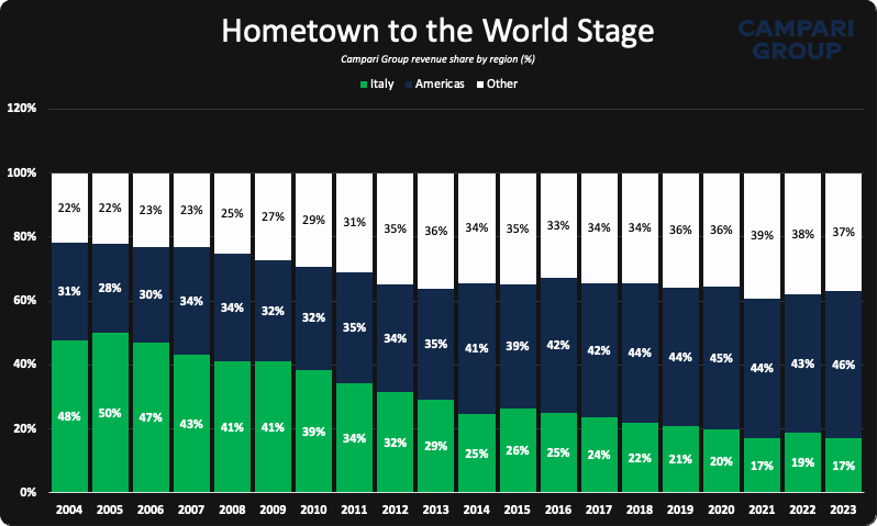 Once accounting for 50% of sales (2005), Italy remains an integral part of the identity of Campari and many of its brands. But it’s no longer the dominant market; a trend which has been in motion since the turn of the century.