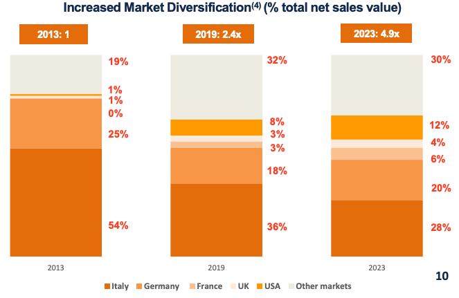 The geographic dispersion of Aperol’s sales broadened as it found success internationally. Still a popular staple in Italy, Aperol now derives a larger share of its revenue across Western Europe as well as in the USA. This trend perforated across the entire group as they looked to de-risk themselves from Italy and capitalise on a global scale.