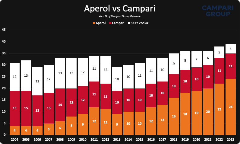 In 2003, eyeing something special about their orange-tinted cousin, Campari paid €150 million for Aperol, whose revenue was ~€30 million at the time. Back then, Campari’s flagship brands were Campari (15% of sales) and SKYY Vodka (12% of sales, acquired in 2002). By 2011, Aperol briefly became the group’s largest brand; later cementing its place more permanently. Today, it accounts for almost a quarter of group sales. Perhaps the Campari Group ought to consider a name change.
