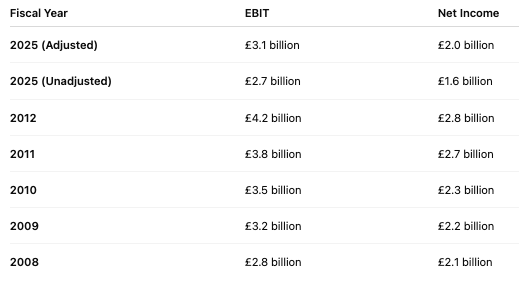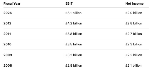If we run our finger down the income statement and focus on operating income (EBIT), Tesco reported £3.1 billion in EBIT in the latest fiscal year (2025) with £2 billion in net income after interest and tax. This does reflect the highest earnings over the course of the current decade. But a glance at Tesco in the pre-scandal era of 2009 through 2012 (fiscal years) shows that this is by no means “record breaking profits”.