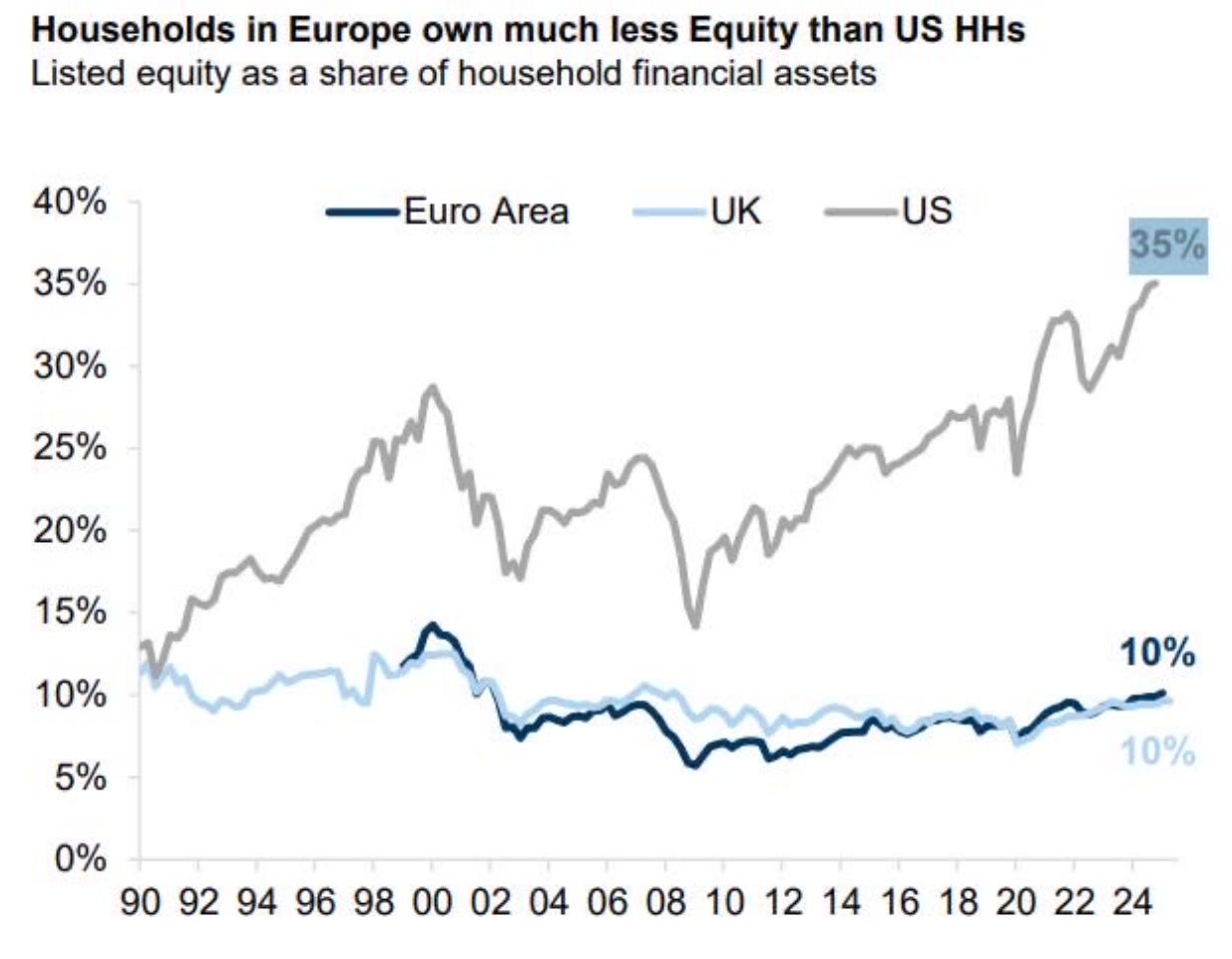 With respect to household wealth, the US stands head and shoulders above the UK and EU, with ~35% of household financial assets devoted to listed equities, compared to 10% for the UK and Euro Area.