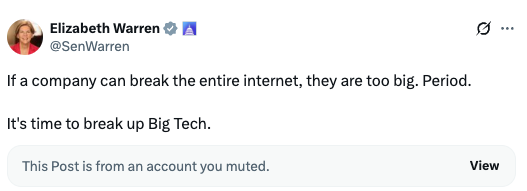 This time, it was the turn of US Senator Elizabeth Warren. “If a company can break the entire internet, they are too big. Period”, she proclaimed. Promptly followed up by her catchphrase, “It’s time to break up Big Tech”.